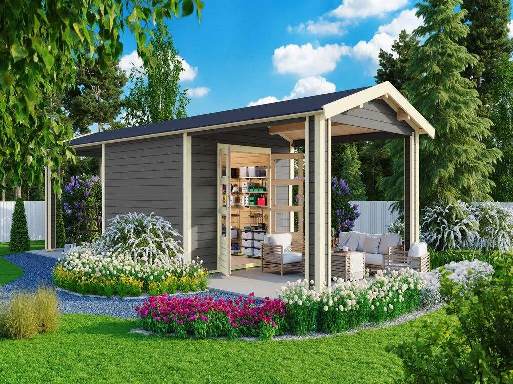 Das Gartenhaus wird aus 28 mm starken Wandbrettern aus nordischer Fichte im Steck-/Schraubsystem gefertigt und gewährleistet somit einen einfachen Aufbau und eine stabile Konstruktion. Das Satteldach besteht aus Massivholzdach.