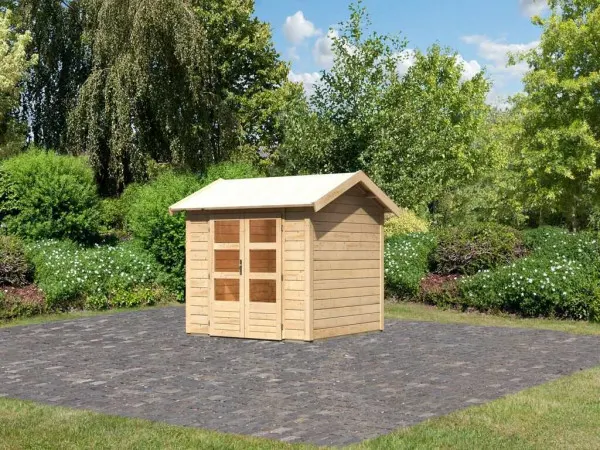Das Gartenhaus wird aus 28 mm starken Wandbrettern aus nordischer Fichte im Steck-/Schraubsystem gefertigt und gewährleistet somit einen einfachen Aufbau und eine stabile Konstruktion. Das Satteldach besteht aus Massivholzdach.