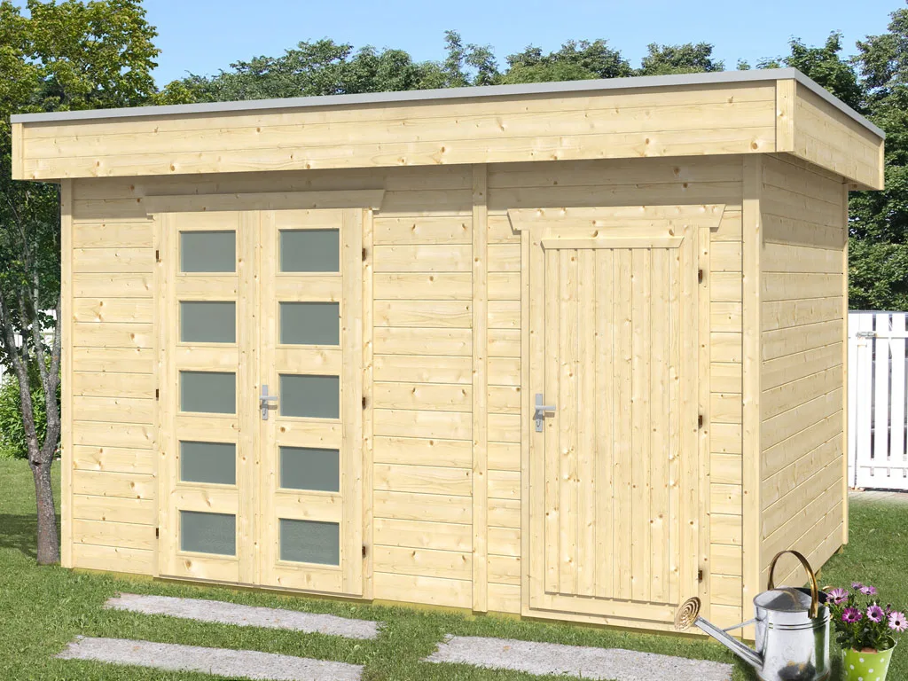 Die Grundfläche dieses Gartenhauses beträgt 9,5 m² mit einem Sockelmaß (Haus ohne Anbau) von 377,2 x 247,2 cm (B x T). Eine optimale Raumnutzung wird dank einer Firsthöhe von 255 cm gewährt.