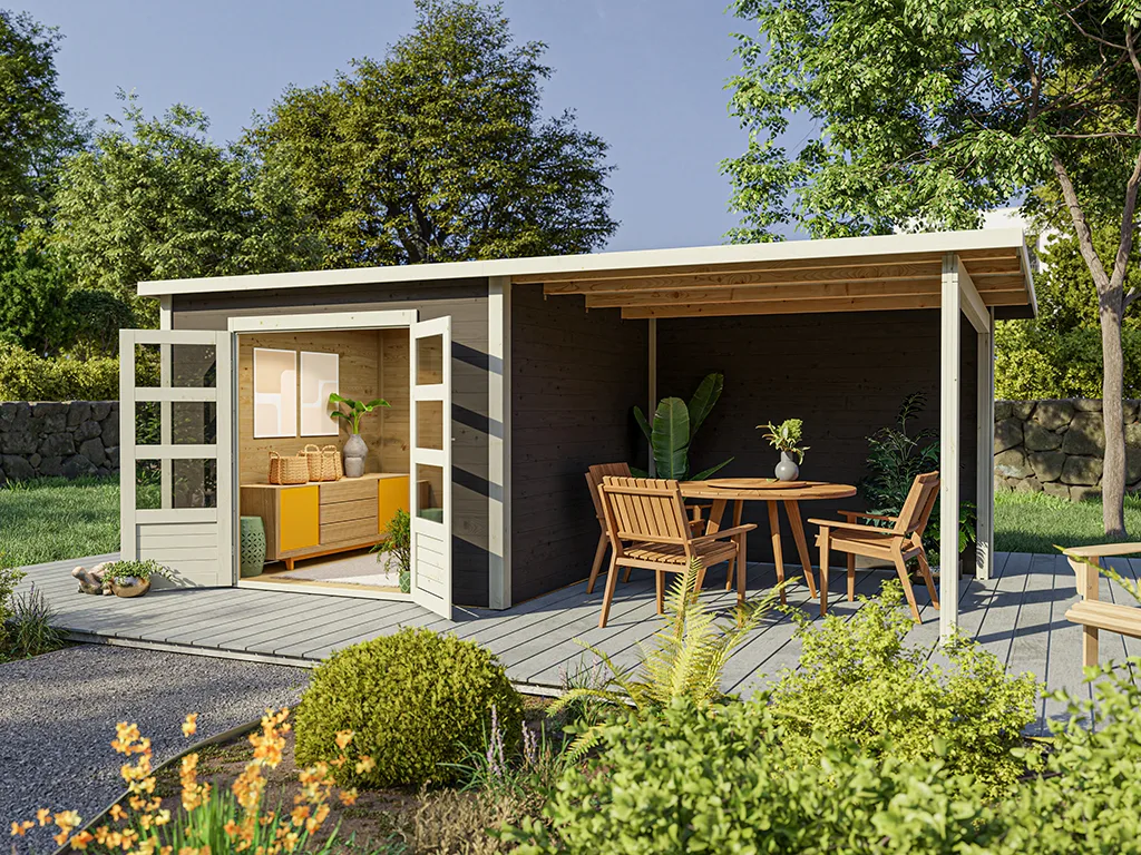 Das Gartenhaus mit Anbaudach und Rückwand ist sehr vielseitig. Der durch das Anbaudach geschaffene zusätzliche Stauraum eignet sich optimal als Lagerplatz für Gartenutensilien oder als Sitzbereich zum gemütlichen Verweilen. Dank Überdachung und integrierter Rückwand sind Geräte und Gartenmöbel optimal vor Wind und Wetter geschützt.