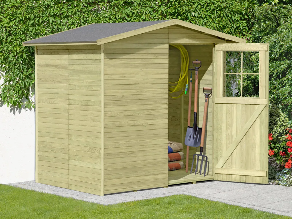 Der 14 mm starke Fußboden des Gerätehauses und die Dachpappe zur Ersteindeckung sind bereits im Lieferumfang enthalten.