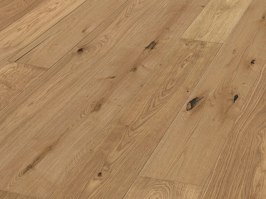Parkettböden in der Sortierung „authentic“ zeigen ein ausgeprägtes Farb- und Strukturspiel. Größere Äste, Risse und Splintanteile gehören zum rustikalen Gesamtbild. Astausbrüche und Risse werden fachmännisch ausgespachtelt. Kleine nicht spachtelfähige Risse und Äste können vorkommen.