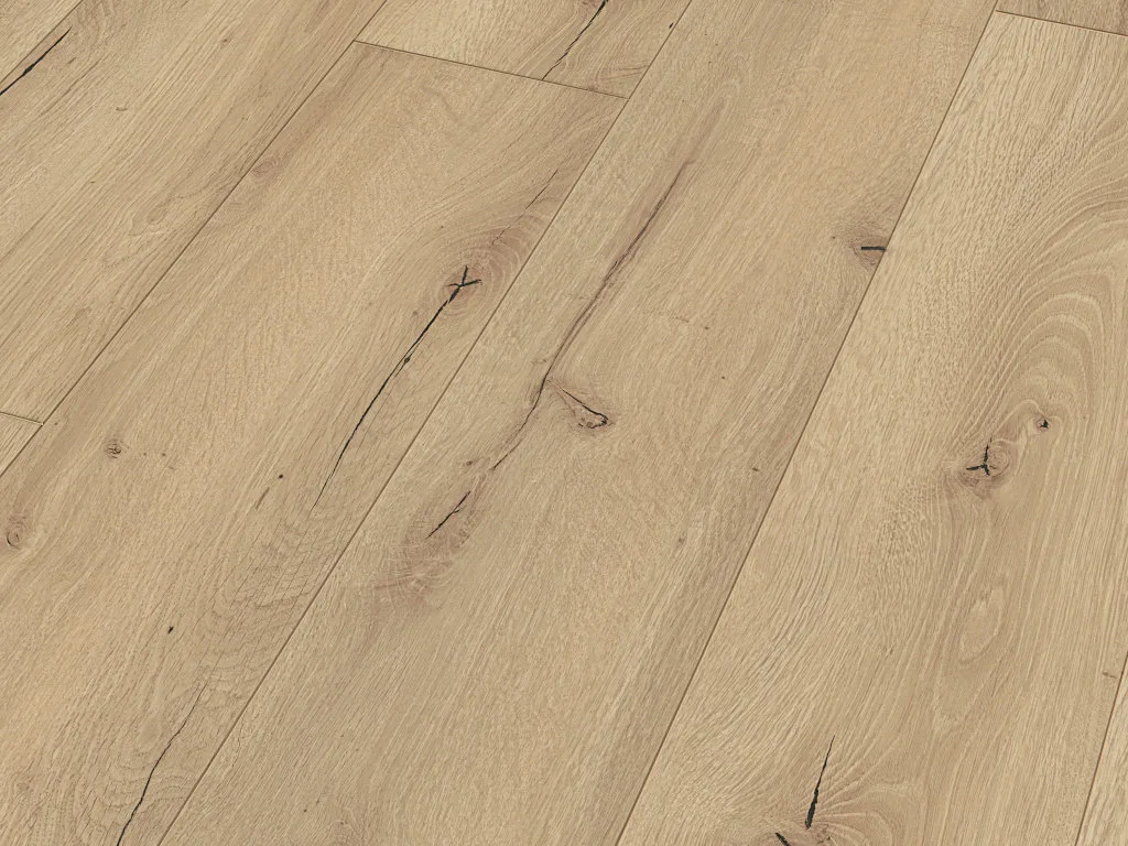 Das Dekor in authentischer Eichenholzoptik vermittelt fühlbare Wärme und Behaglichkeit. Landhausdielen sind perfekt für alle, die den authentischen Holzcharakter ihres Bodens hervorheben möchten – für ein rustikales Flair. Die an vier Seiten umlaufende Fase hebt den Dielencharakter besonders hervor. Dank der strukturierten Oberfläche entsteht optisch und fühlbar der Eindruck eines echten Holzbodens.