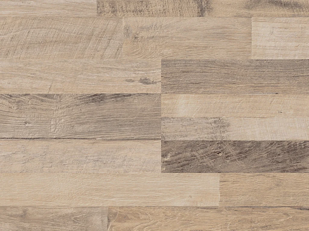 Die Dielen haben eine Breite von 19,5 cm, eine Länge von 128,8 cm und sind 0,8 mm stark. Der Aufbau des Laminats besteht aus drei übereinander liegenden Schichten: Ganz unten der Gegenzug/Stabilisierungsfilm, in der Mitte der HDF-Träger mit dem Verbindungssystem und oben die robuste Oberflächen- und Dekorschicht.