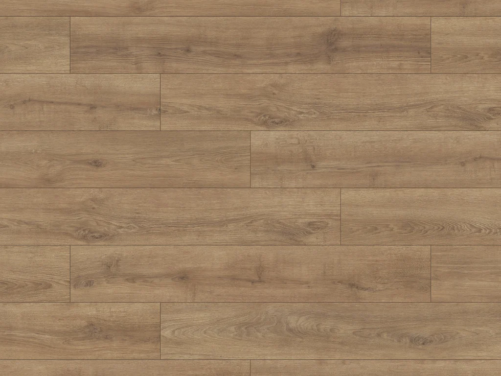 Das Dekor in edler Eichenholzoptik passt perfekt zu nahezu allen aktuellen Einrichtungsstilen. Landhausdielen besitzen mit ihrer Ein-Stab-Optik einen natürlichen und rustikalen Look, der jeden Raum gemütlich wirken lässt. Die an vier Seiten umlaufende Fase strukturiert das Verlegebild und verleiht ihm ein gleichmäßiges Muster. Dank der strukturierten Oberfläche entsteht optisch und fühlbar der Eindruck eines echten Holzbodens.