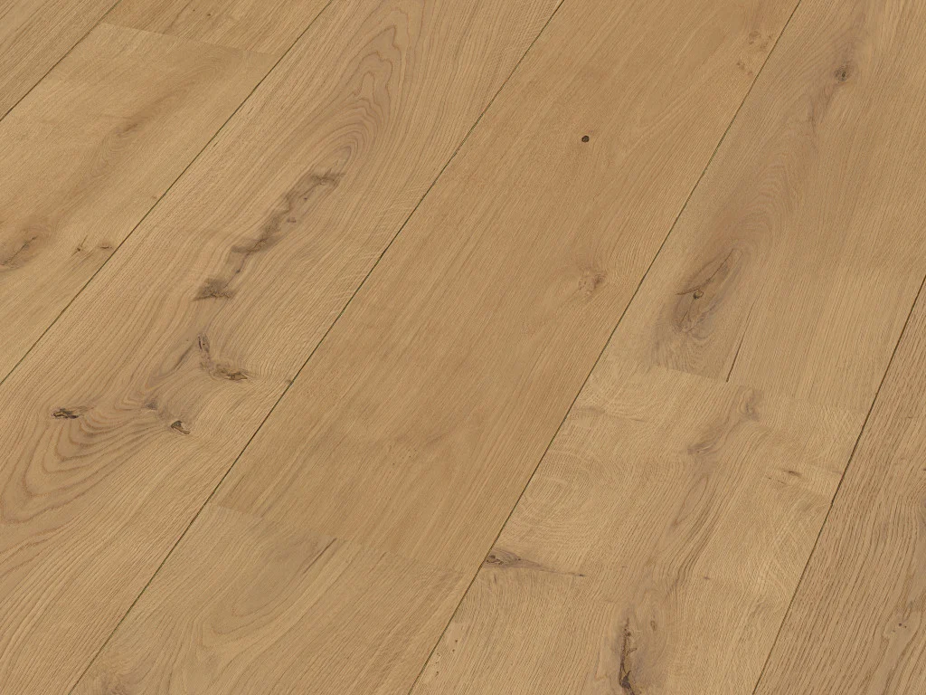 Typisch für das verwendete Eichenholz dieses Bodens sind die Jahresringe sowie kleinere oder größere Astfüllungen, die für einen einzigartigen, individuellen Look in deinem Heim sorgen. Aufgrund seiner Härte und einzigartigen Maserung ist der Eichenholzboden der ultimative Lieblingsboden der Europäer. Landhausdielen sind perfekt für alle, die den authentischen Holzcharakter ihres Bodens hervorheben möchten – für ein rustikales Flair. Die 4-seitig umlaufende V-Fuge betont die Dielenoptik.
