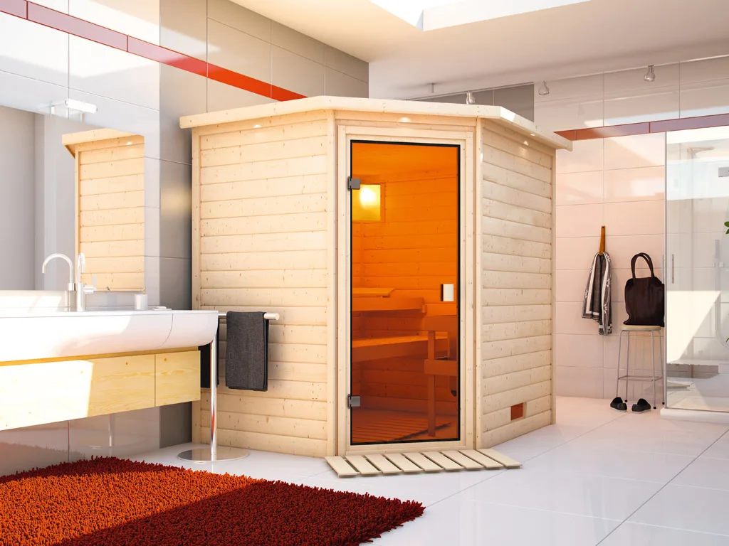 Aus 38 mm dicken Vollholz-Bohlen und einem mit Mineralwolle gedämmten und Softline-Profilholz verkleideten Dach besteht diese Massivholzsauna. Ein Steck- und Schraubsystem sorgt für schnellen und unkomplizierten Aufbau. Doppelnut und -feder Verbindungen fixieren die Sauna-Konstruktion formstabil.