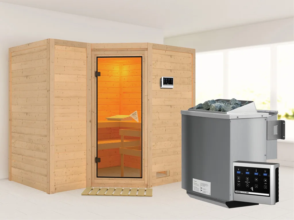 Massivholzsauna Sahib 2 bronzierte Ganzglastür, inkl. 9 kW Bio-Ofen ext. Steuerung