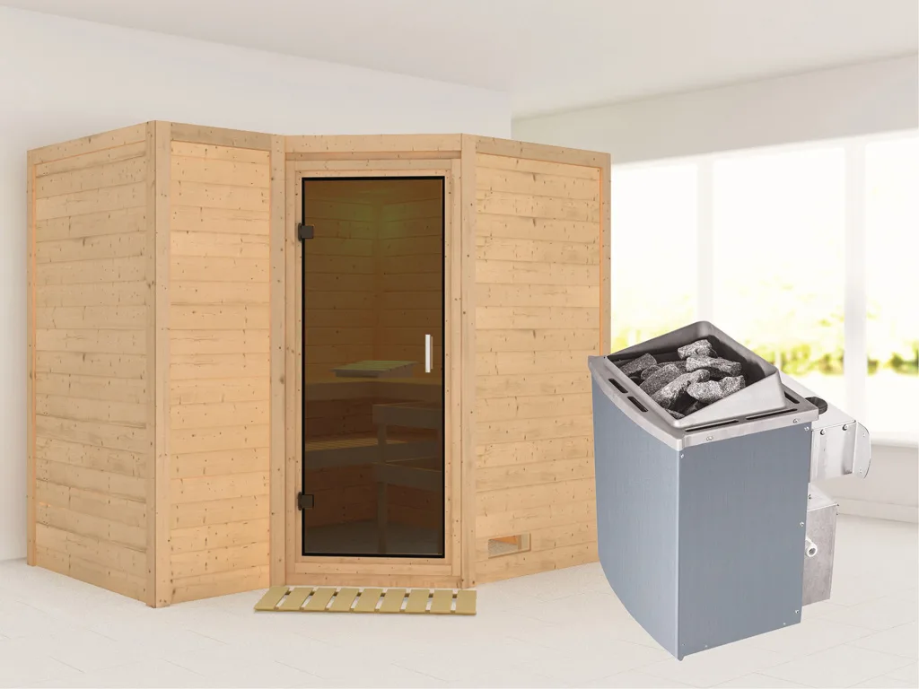 Massivholzsauna Sahib 2 graphit Ganzglastür, inkl. 9 kW Saunaofen integr. Steuerung