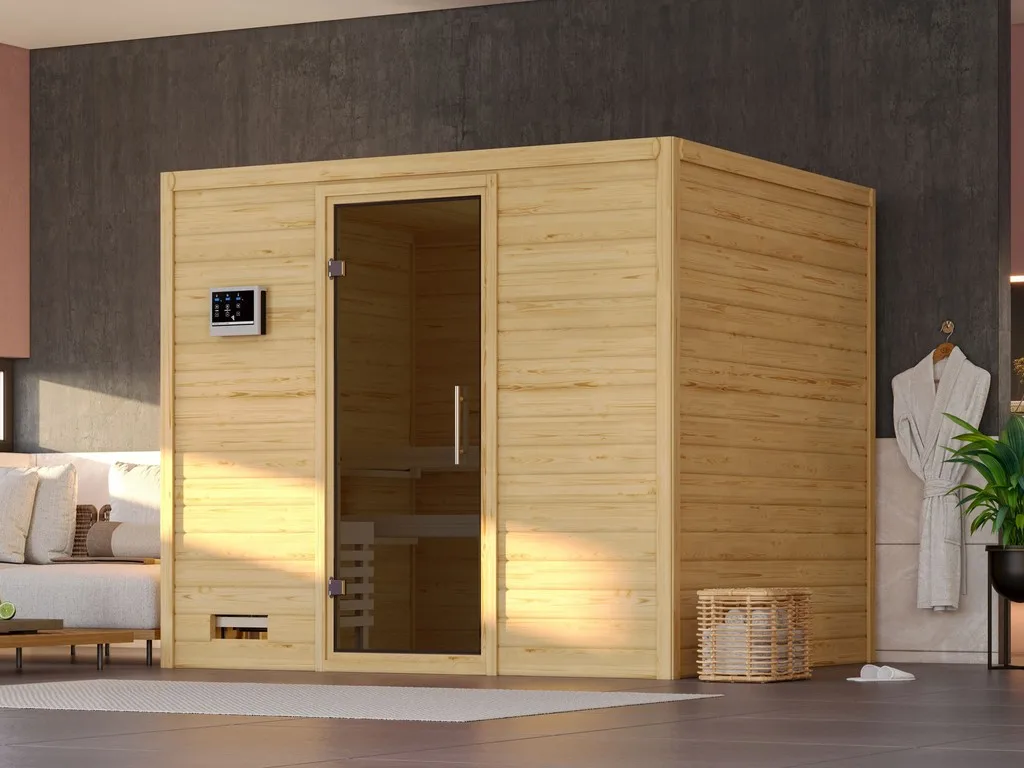 Diese Innensauna wird mit Saunaofen und einer externen Steuerung geliefert. Die Anbringung des Steuergerätes erfolgt an der Außenseite der Sauna. Ganz komfortabel kann somit die Saunasteuerung von außen erledigt und die Temperatur exakt bestimmt werden. Zusätzlich verfügt das Steuergerät über eine Anschlussstelle, über die ein weiteres elektrisches Gerät bedient werden kann.