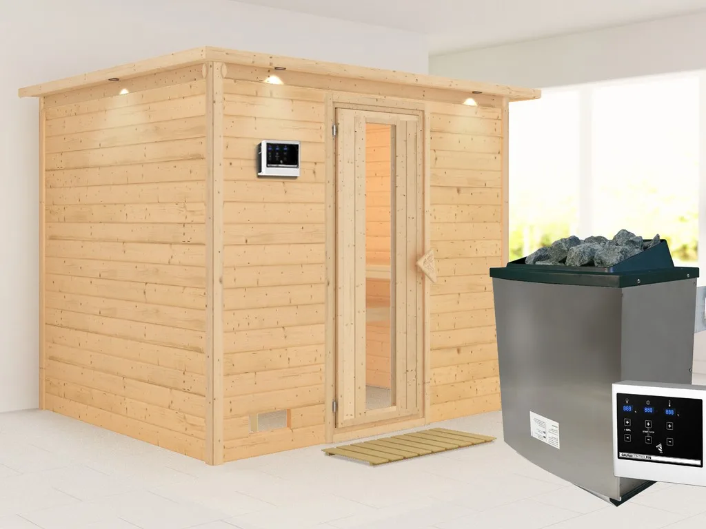 Bei dieser Innensauna ist ein Saunaofen mit einer externen Steuerung inklusive. Das Steuergerät wird außerhalb der Sauna angebracht. Auf diese Weise fängt schon vor dem Saunieren der Komfort an – mit einer bequemen Bedienung von außen und einer noch exakteren Temperatureinstellung. Weitere elektrische Geräte, wie die Kabinenbeleuchtung, können ebenso an die externe Steuerung angeschlossen und bedient werden.