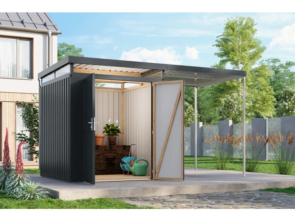 Metall-Gerätehaus Aurum 2 anthrazit im Set mit Anbau