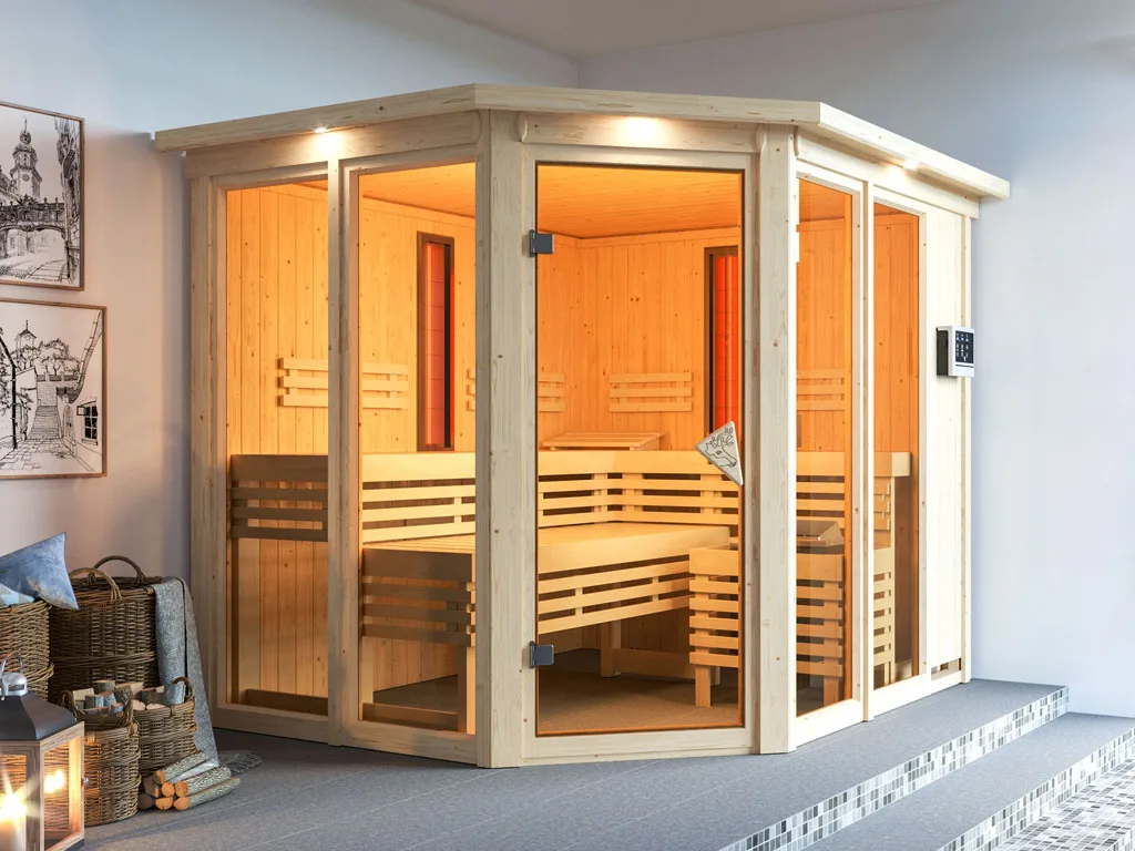 Bei dieser Innensauna ist ein Saunaofen mit einer externen Steuerung inklusive. Das Steuergerät wird außerhalb der Sauna angebracht. Auf diese Weise fängt schon vor dem Saunieren der Komfort an – mit einer bequemen Bedienung von außen und einer noch exakteren Temperatureinstellung. Weitere elektrische Geräte, wie die Kabinenbeleuchtung, können ebenso an die externe Steuerung angeschlossen und bedient werden.