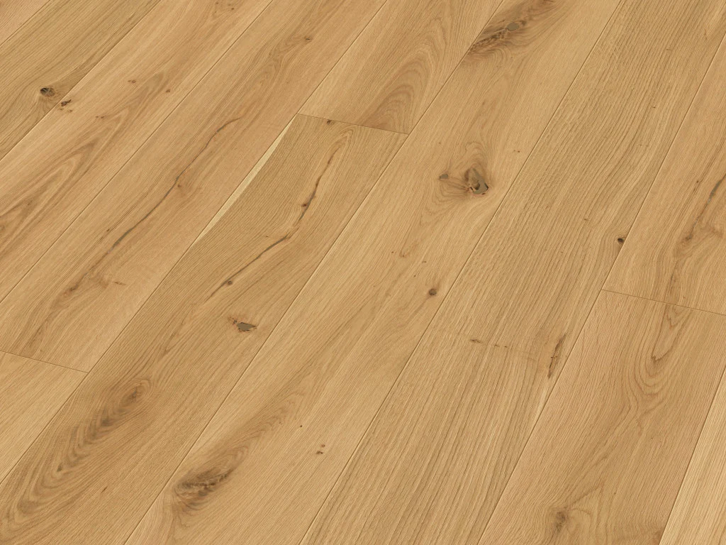Die Dielen haben eine Breite von 18 cm, eine Länge von 220 cm und sind 13 mm stark. Die Klickverbindung "Masterclic Plus" garantiert eine schnelle und leicht zu handhabende schwimmende Verlegung. Die pflegeleichte 2,5 mm Nutzschicht besteht aus hochwertigem Edelholz und macht den Boden besonders robust. Über einer Warmwasserfußbodenheizung kann dieser Boden problemlos verlegt werden.