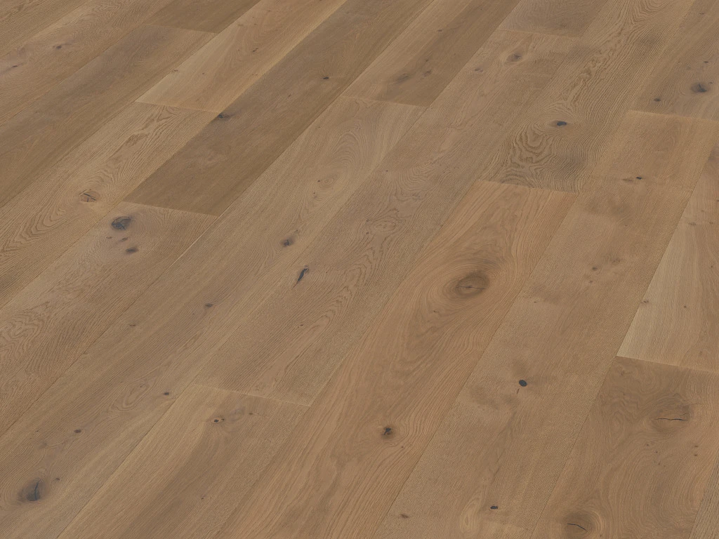 Dieser Boden aus Eichenholz stellt seine zeitlos schöne Wirkung unter Beweis – Echte Eiche spricht für sich selbst. Doch auch technisch kann Eiche punkten: aufgrund ihrer hohen Rohdichte wirkt diese Holzart besonders wärmeleitend und sorgt für stets warme Füße.