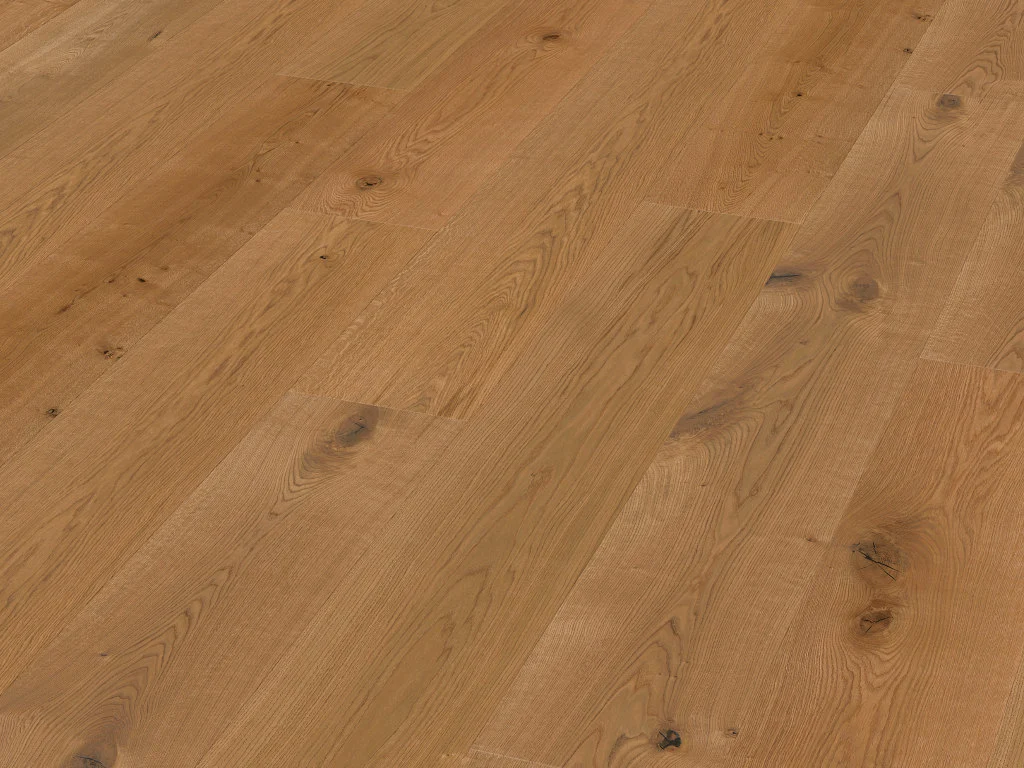 Mit 305 mm sind die Dielen dieses Parkettbodens außergewöhnlich breit. Das verschafft ihnen eine besonders solide und stabile Erscheinung. Charakteristisch bei diesem Eiche -Boden sind die exklusiven Dielen, die mit ihrer beachtlichen Länge von 2400 mm die ungebrochene Dynamik echten Holzes ausstrahlen.