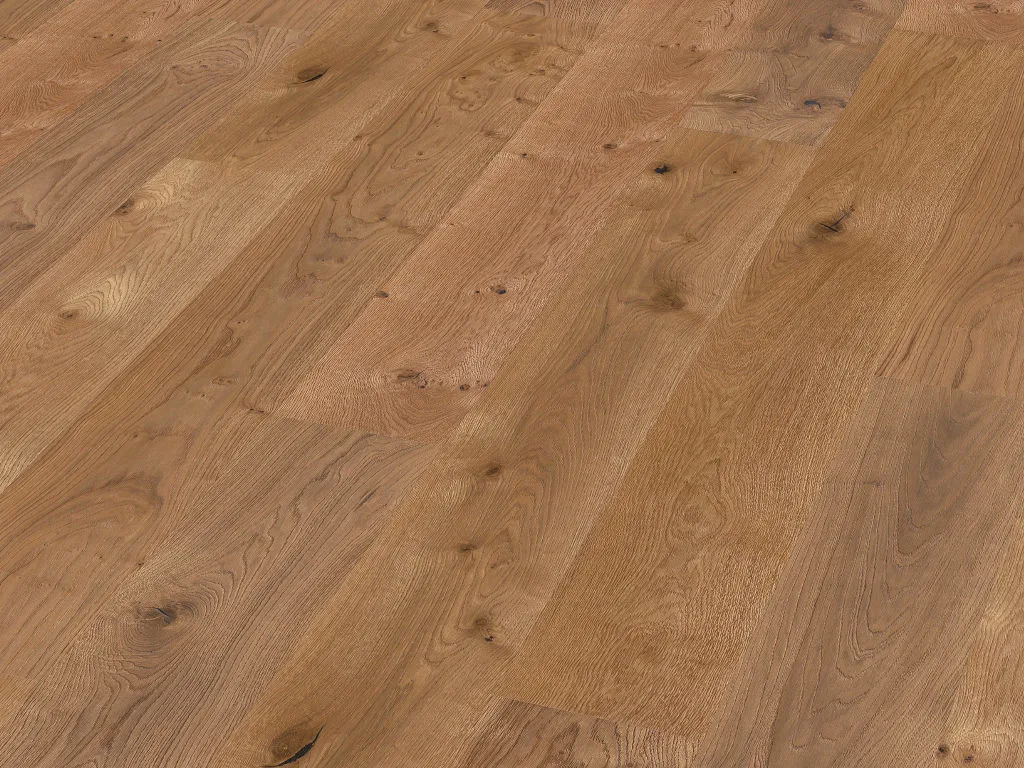Dieser Boden aus Eichenholz stellt seine zeitlos schöne Wirkung unter Beweis – Echte Eiche spricht für sich selbst. Doch auch technisch kann Eiche punkten: aufgrund ihrer hohen Rohdichte wirkt diese Holzart besonders wärmeleitend und sorgt für stets warme Füße.