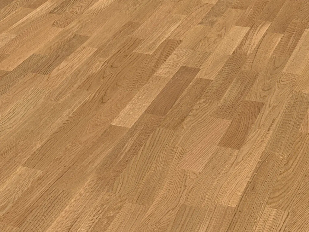 3-Schicht-Parkett besteht aus einer Edelholz-Nutzschicht, einer Mittellage aus MDF, HDF oder Holz (z. B. Pappel oder Fichte) sowie einem Gegenzug, der dem Verziehen des arbeitenden Holzes entgegenwirkt. Es besitzt einen symmetrischen Aufbau und damit optimale Dimensionsstabilität bei zum Beispiel höherer Luftfeuchtigkeit. Die pflegeleichte Nutzschicht von 2,5 mm komplettiert das stimmige Gesamtpaket der Dielen und macht sie besonders robust. Für die Verlegung auf einer Warmwasserfußbodenheizung ist das Parkett geeignet.