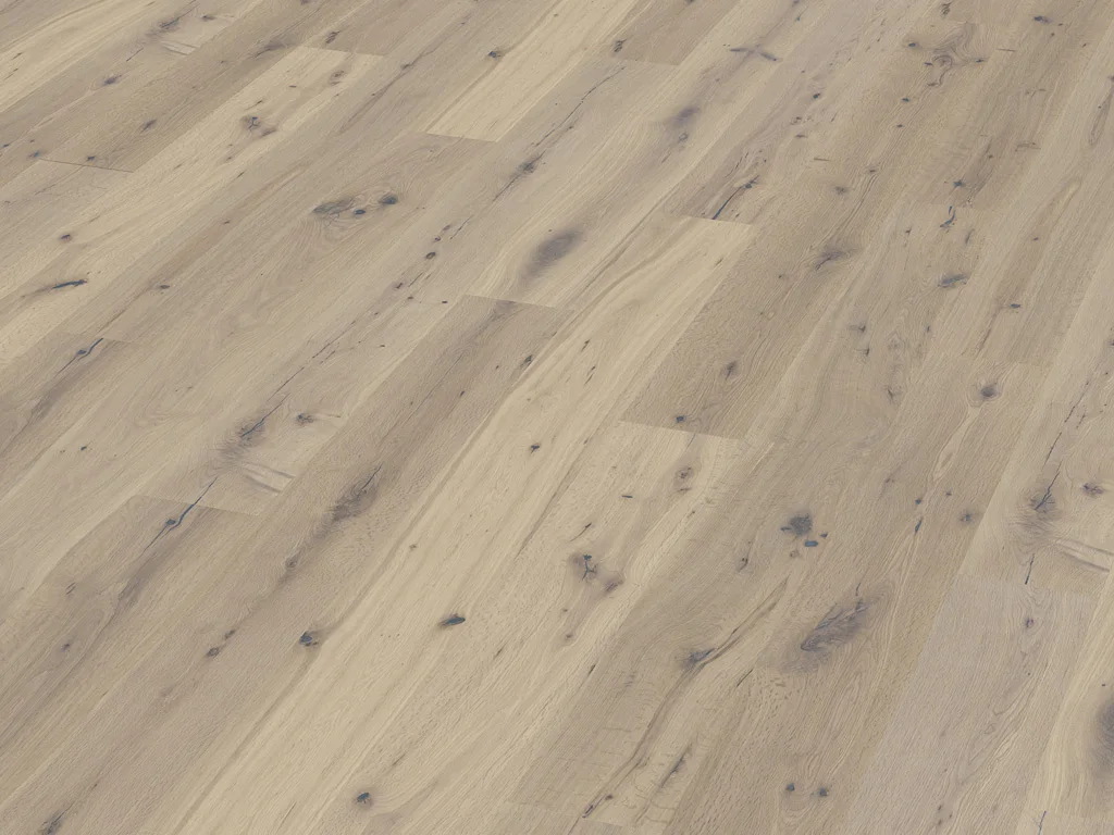 Landhausdielen besitzen mit ihrer Ein-Stab-Optik einen natürlichen und rustikalen Look, der jeden Raum gemütlich wirken lässt. Die an vier Seiten umlaufende Fase strukturiert das Verlegebild und verleiht ihm ein gleichmäßiges Muster. Die Oberfläche des Holzes ist weiß-geölt, ein natürlicher Farbton, der sehr gut mit allen modernen, jungen Einrichtungsstilen harmoniert. Die weichen Anteile des Oberflächenholzes wurden bei dieser Diele ausgebürstet. So entsteht die strukturierte, markante Oberfläche aus härterem Holz.