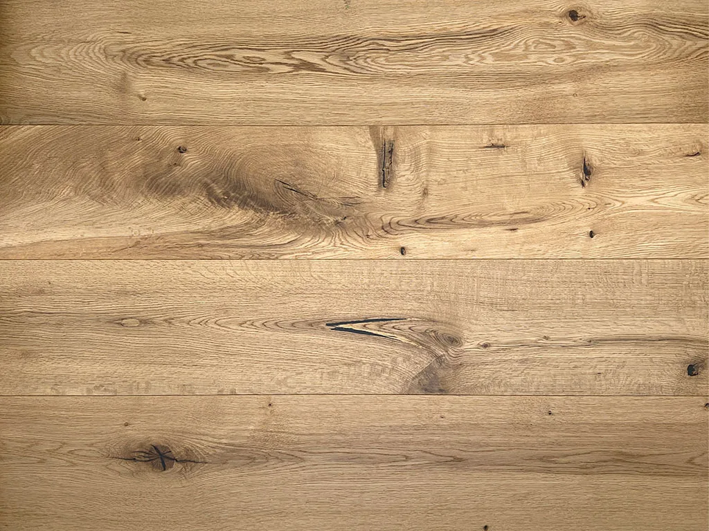 Von weicheren Holzschichten befreit, bildet das harte, stabile Kernholz der Diele eine fühlbar strukturierte, dreidimensionale und lebendig wirkende Oberfläche. Hochwertige natürliche Öle zur Oberflächenbehandlung lassen das Holz atmen und bieten ihm Schutz.