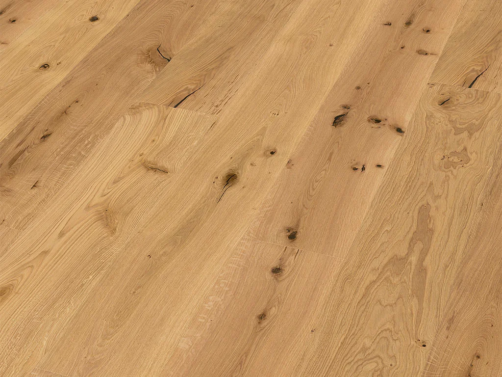 Typisch für das verwendete Eichenholz dieser Diele sind die Jahresringe sowie kleinere oder größere Astfüllungen, die für einen einzigartigen, individuellen Look in deinem Heim sorgen. Aufgrund seiner Härte und schönen Maserung ist der Eichenholzboden der ultimative Lieblingsboden der Europäer.