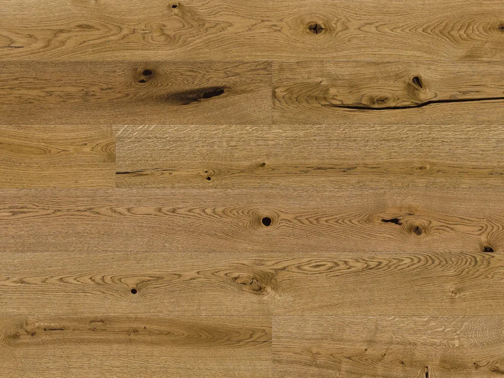 Das Parkett ist rustikal gemasert: Es finden sich viele schwarze Astlöcher und wenige Risse im Holz.
