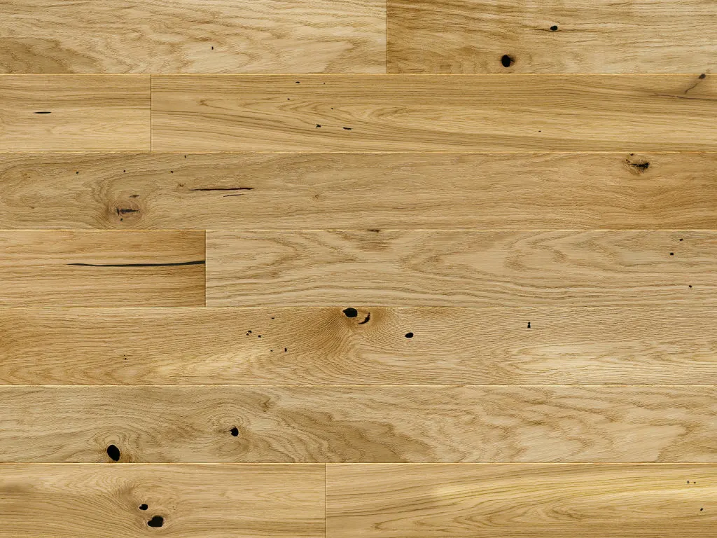 Das Parkett ist rustikal gemasert: Es finden sich viele schwarze Astlöcher und wenige Risse im Holz.