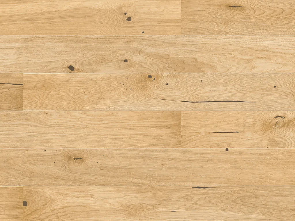 Das Parkett ist rustikal gemasert: Es finden sich viele schwarze Astlöcher und wenige Risse im Holz.