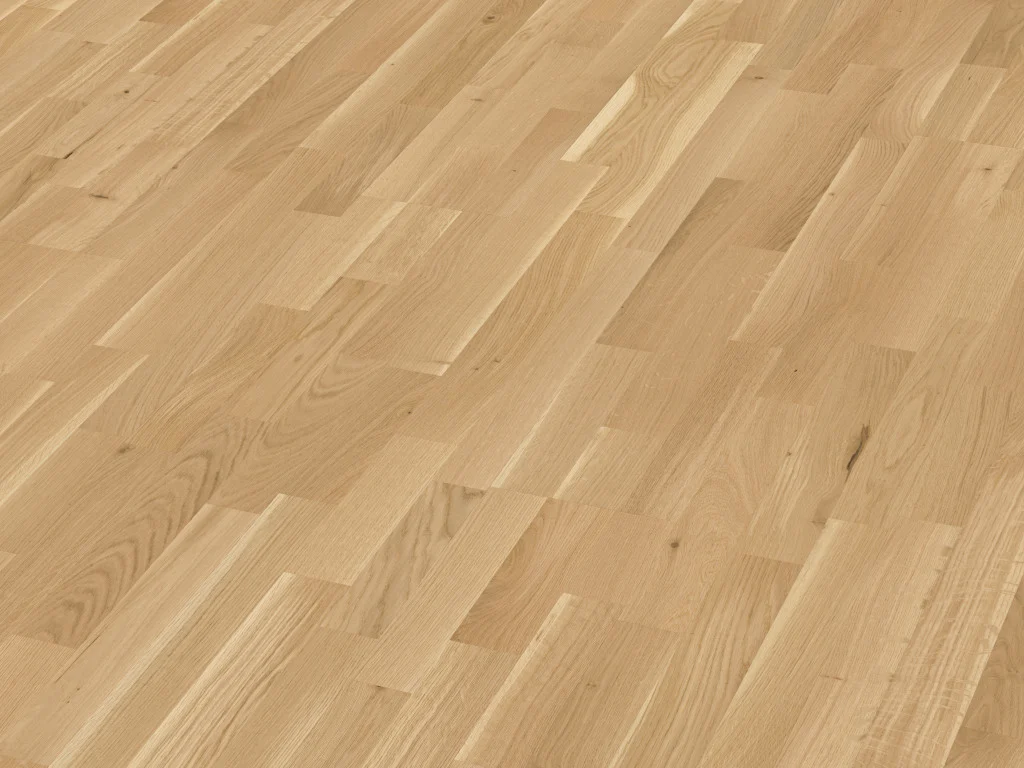 Die oberste, besonders pflegeleichte Schicht des Fertigparketts bildet die 2,5 mm starke Edelholz-Nutzschicht aus echter Eiche.