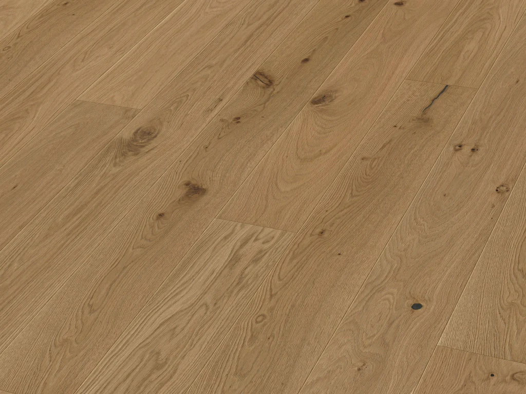 Optisch und auch haptisch gibt dieser Boden aus Eiche einiges her: die natürlich bis lebhafte, individuelle Maserung und der gediegene, matte Glanz dieses Hart- und Edelholzes verleihen Deinem Wohnraum einen Hauch von Luxus.