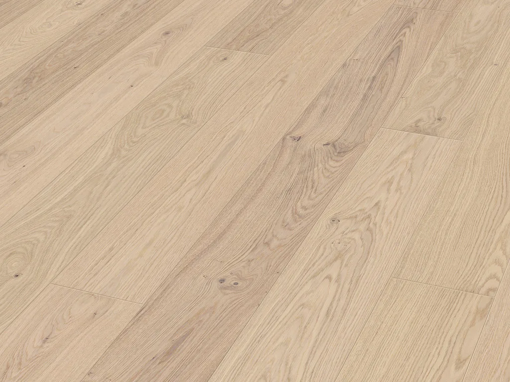 Optisch und auch haptisch gibt dieser Boden aus Eiche einiges her: die natürlich bis lebhafte, individuelle Maserung und der gediegene, matte Glanz dieses Hart- und Edelholzes verleihen Deinem Wohnraum einen Hauch von Luxus.