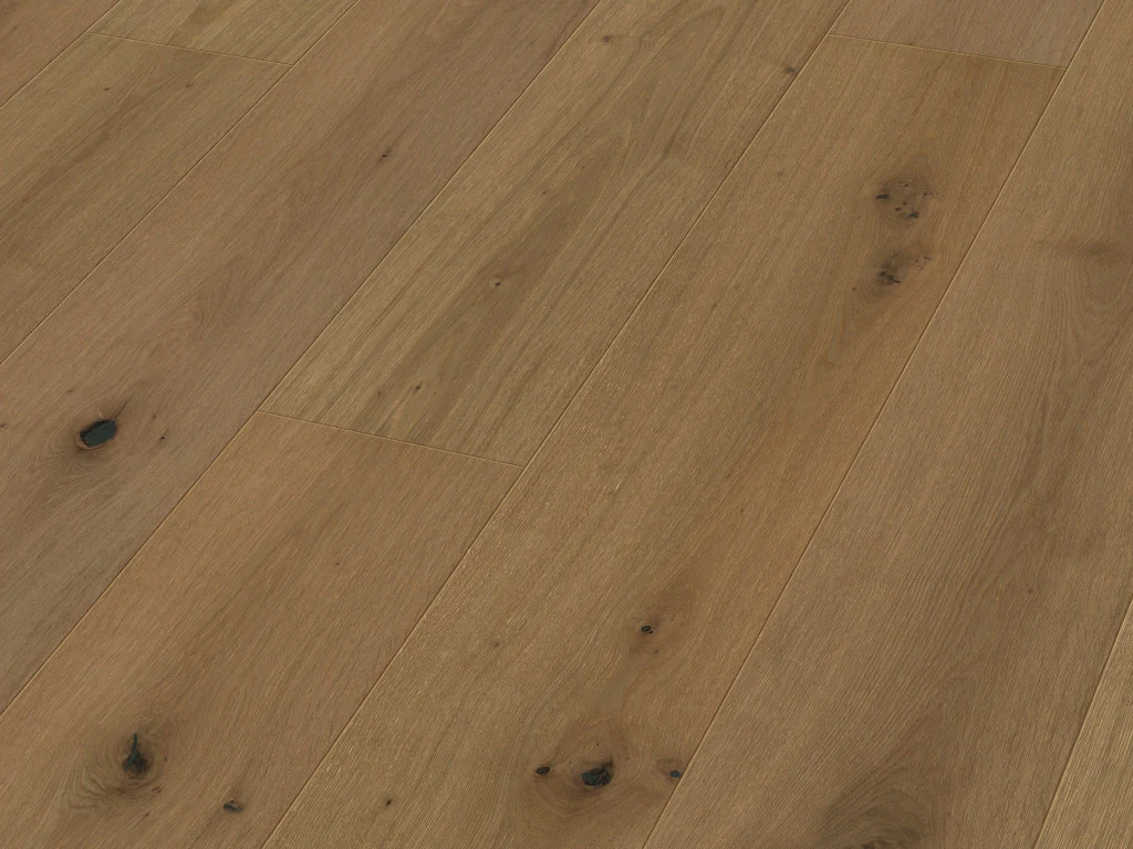 Optisch und auch haptisch gibt dieser Boden aus Eiche einiges her: die natürlich bis lebhafte, individuelle Maserung und der gediegene, matte Glanz dieses Hart- und Edelholzes verleihen Deinem Wohnraum einen Hauch von Luxus.