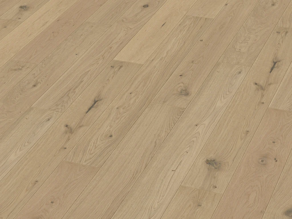 Typisch für das verwendete Eichenholz dieser Diele sind die Jahresringe sowie kleinere oder größere Astfüllungen, die für einen einzigartigen, individuellen Look in Deinem Heim sorgen. Aufgrund seiner Härte und schönen Maserung ist der Eichenholzboden der ultimative Lieblingsboden der Europäer.