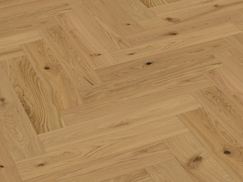 Das Fischgrät-Design dieses Bodens verleiht Deinem Zuhause ein ganz besonderes Flair: einen Hauch von Luxus. Die an vier Seiten umlaufende Fase hebt den Dielen-Charakter besonders schön hervor. Aufgrund der strapazierfähigen Lack-Versiegelung ist die sensible Oberfläche hervorragend gegen Schmutz, Feuchtigkeit und Kratzer gewappnet. Die weichen Anteile des Oberflächenholzes wurden bei dieser Diele ausgebürstet. So entsteht die strukturierte, markante Oberfläche aus härterem Holz.