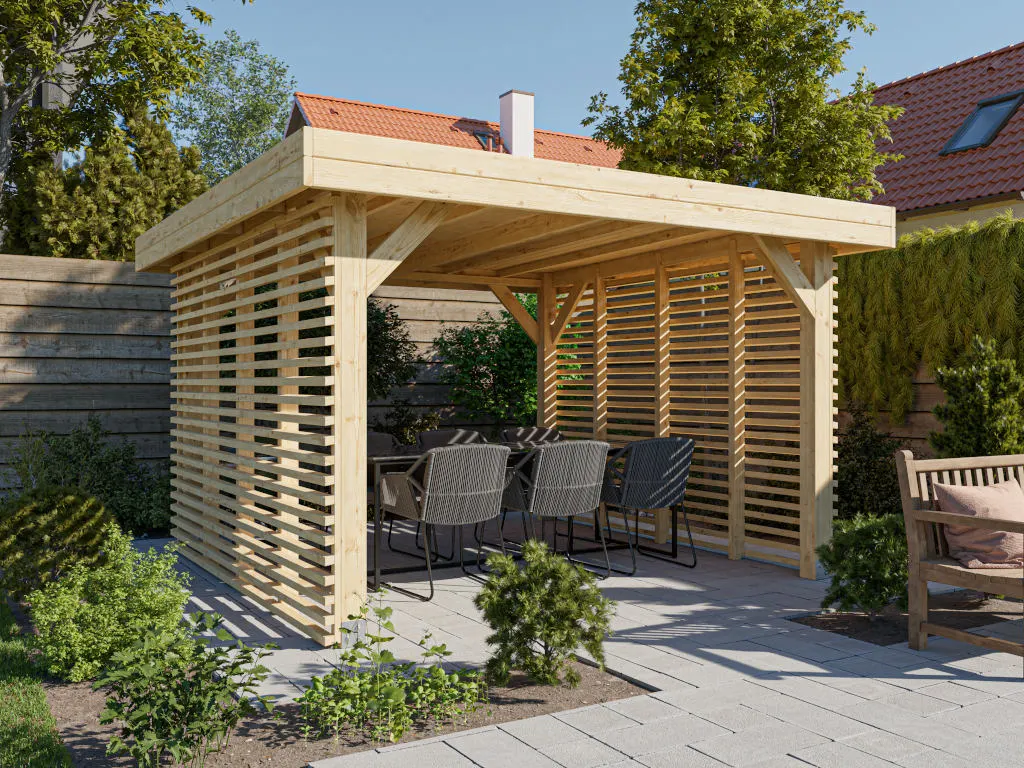 Das naturbelassene Holz sorgt für ein natürliches und zeitloses Aussehen. Außerdem ermöglicht dir das unbehandelte Holz, das Äußere des Pavillons ganz nach deinen eigenen Wünschen zu gestalten.