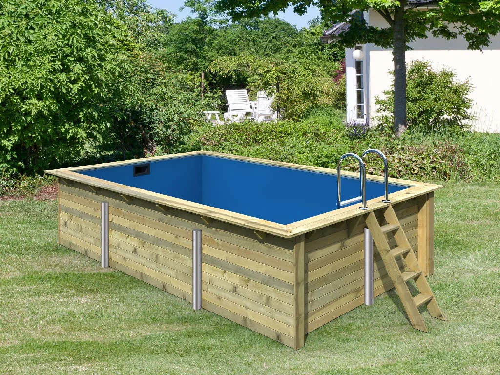 Dieser viereckige Pool fügt sich mit seiner hölzernen Beckenwand harmonisch ins natürliche Gesamtbild deines Gartens ein und macht dabei einen wertigen und soliden Eindruck.