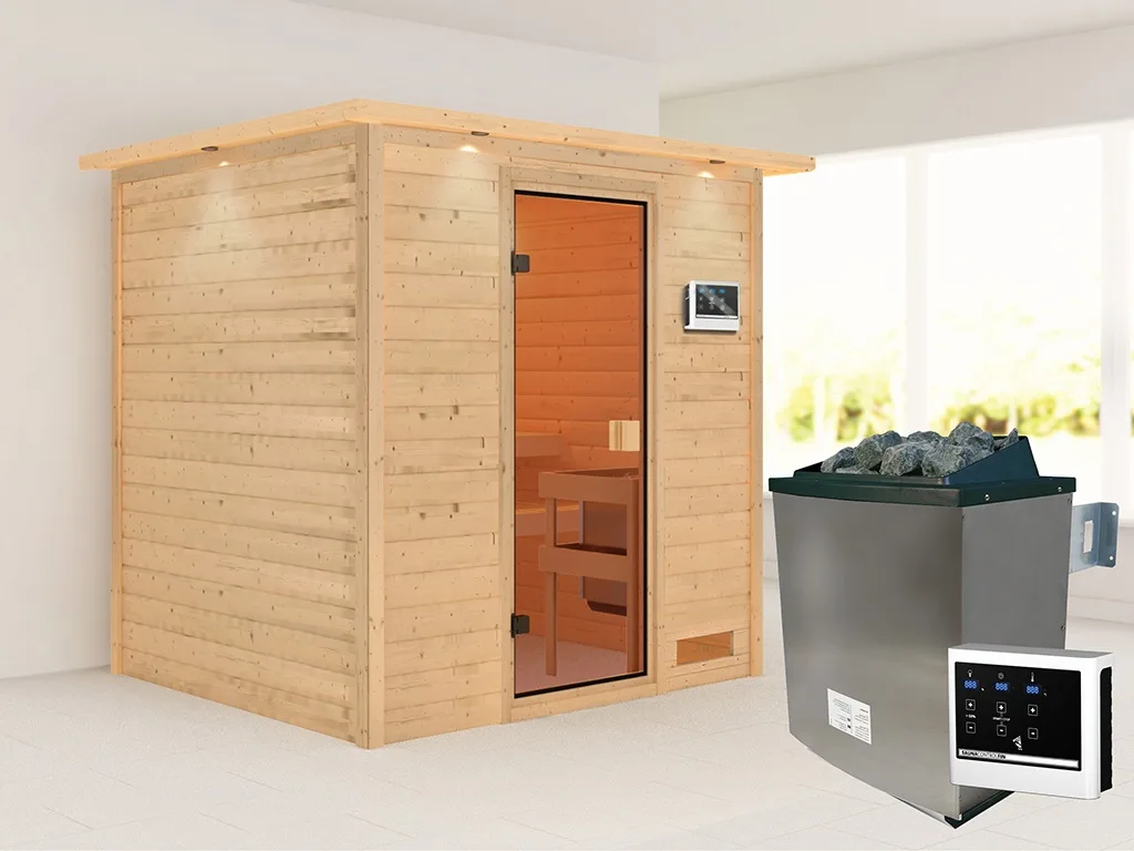 Unsere Wellnessartikel (Saunen, Saunahäuser, Saunafässer, Kotas, Infrarotkabinen, Saunaöfen etc.) dürfen nur für den privathäuslichen Gebrauch verwendet werden! Saunaöfen und dazugehörige Steuerelemente dürfen nur durch einen örtlich zugelassenen Elektroinstallateur mittels festem Anschluss an das Netz angeschlossen werden. Ausnahme: 230 Volt Plug-&-Play-Saunaöfen. Die Mindestsicherheitsabstände vom Ofen zur Wand und vom Ofen zum Ofenschutz müssen unbedingt eingehalten werden. Bei 9-kW-Öfen muss die Höhe des Ofenschutzes angepasst werden. Bitte beachte zu den obig genannten Hinweisen die beigefügten Montageanleitungen.