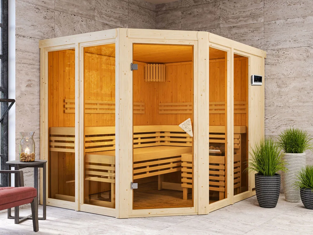 Bei dieser Innensauna ist ein Saunaofen mit einer externen Steuerung inklusive. Das Steuergerät wird außerhalb der Sauna angebracht. Auf diese Weise fängt schon vor dem Saunieren der Komfort an – mit einer bequemen Bedienung von außen und einer noch exakteren Temperatureinstellung. Weitere elektrische Geräte, wie die Kabinenbeleuchtung, können ebenso an die externe Steuerung angeschlossen und bedient werden.