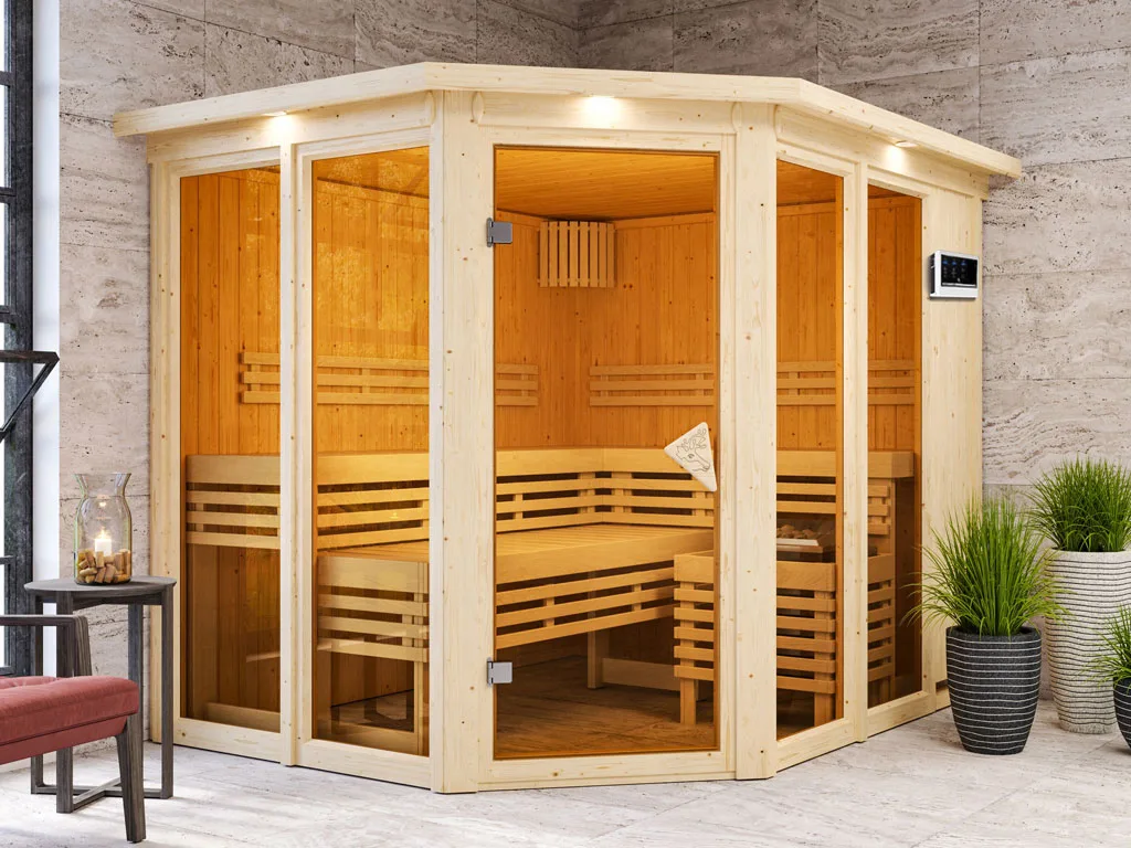 Bei dieser Innensauna ist ein Saunaofen mit einer externen Steuerung inklusive. Das Steuergerät wird außerhalb der Sauna angebracht. Auf diese Weise fängt schon vor dem Saunieren der Komfort an – mit einer bequemen Bedienung von außen und einer noch exakteren Temperatureinstellung. Weitere elektrische Geräte, wie die Kabinenbeleuchtung, können ebenso an die externe Steuerung angeschlossen und bedient werden.