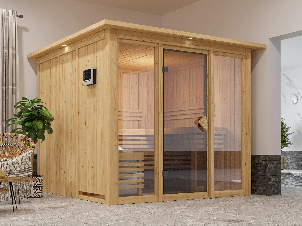 | Lieferumfang | 3 Liegen, 9 KW klassischer Saunaofen mit externer Steuerung |