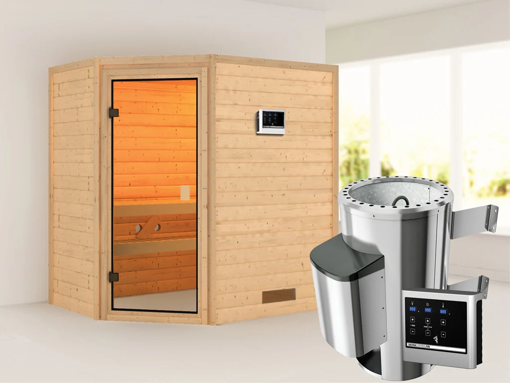 Sauna Jella mit bronzierter Glastür + 3,6 kW Plug & Play Saunaofen ext. Strg.
