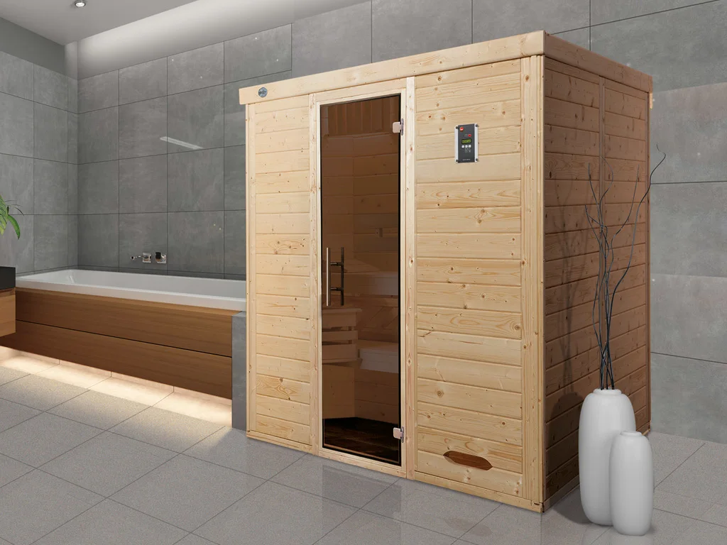 Dieses Saunamodell – eine System- bzw. Elementsauna – zeichnet sich durch seine besondere Sandwich-Bauweise aus, d. h., die Wandelemente bestehen aus einzelnen Schichten. Die bereits vorgefertigten Wandelemente aus Fichte ermöglichen einen schnellen Aufbau innerhalb weniger Stunden. Mit einer Wandstärke von 45 mm sind Systemsaunen optimal isoliert und somit besonders energiesparend. Wegen der sehr gut gedämmten Elemente heizt sich die Systemsauna extra schnell auf.