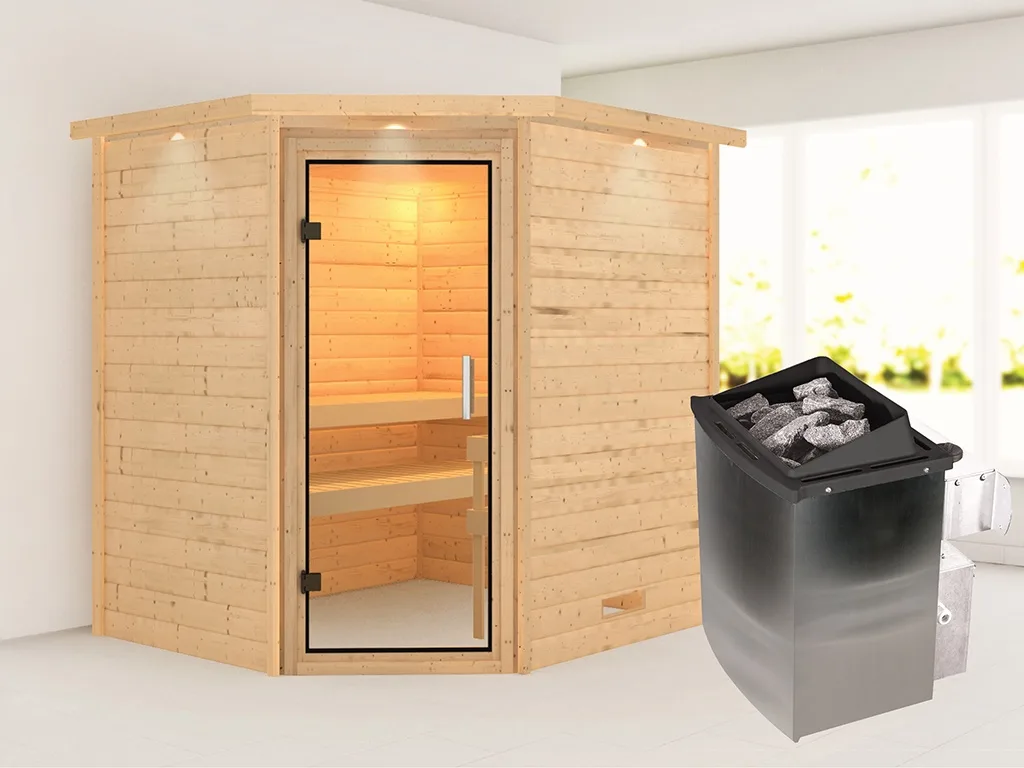 Sauna Massivholzsauna Mia mit Dachkranz, inkl. 9 kW Ofen mit integrierter Steuerung