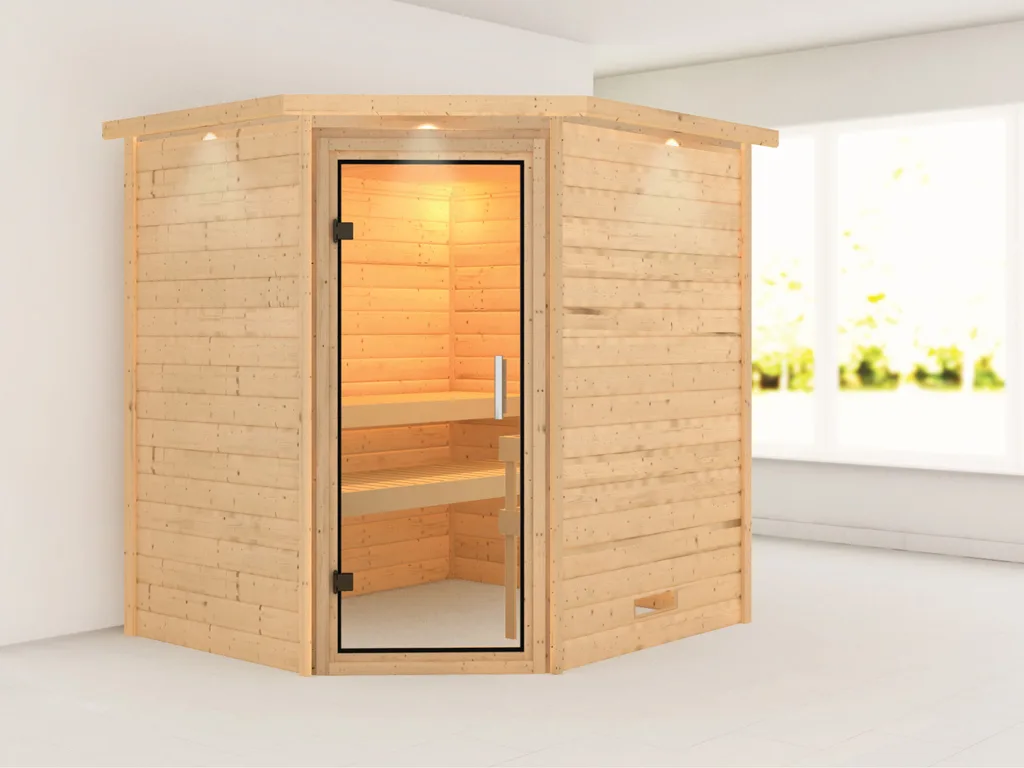 • Eckeinstieg: Diese Sauna mit Eckeinstieg eignet sich besonders gut für kleine Räume. Platzsparend und kompakt passt sie in jeden Raum und nutzt die Fläche optimal.