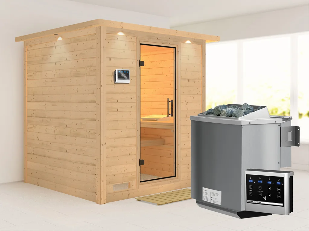 Bei dieser Innensauna ist ein Saunaofen mit einer externen Steuerung inklusive. Das Steuergerät wird außerhalb der Sauna angebracht. Auf diese Weise fängt schon vor dem Saunieren der Komfort an – mit einer bequemen Bedienung von außen und einer noch exakteren Temperatureinstellung. Weitere elektrische Geräte, wie die Kabinenbeleuchtung, können ebenso an die externe Steuerung angeschlossen und bedient werden.
