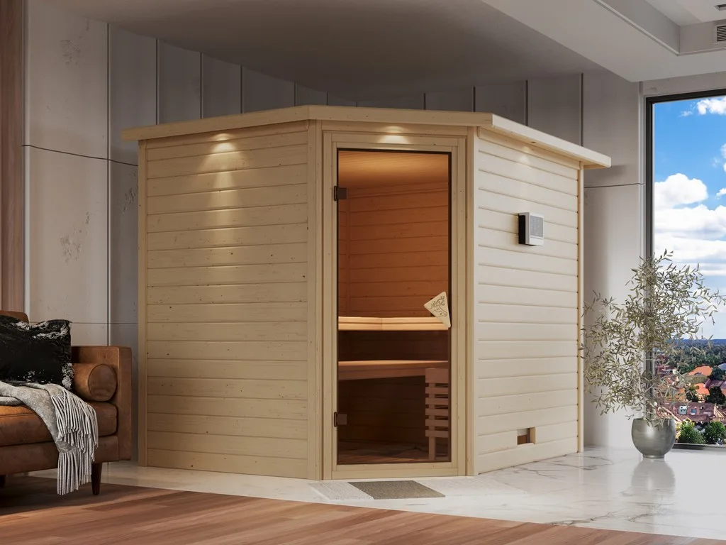 Diese Innensauna wird einschließlich Saunaofen mit externer Steuerung geliefert. Die Anbringung an der Außenseite der Sauna ermöglicht eine praktische Bedienung vor dem Saunieren und eine noch exaktere Einstellung der Temperatur. Weitere elektrische Geräte, wie eine Kabinenbeleuchtung, können ebenso an die externe Steuerung angeschlossen und mit dieser bedient werden.