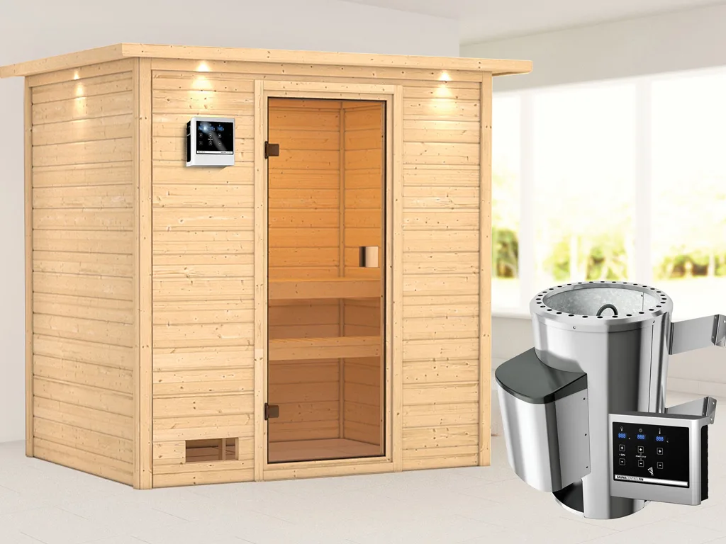 Bei dieser Innensauna ist ein Saunaofen mit einer externen Steuerung inklusive. Das Steuergerät wird außerhalb der Sauna angebracht. Auf diese Weise fängt schon vor dem Saunieren der Komfort an – mit einer bequemen Bedienung von außen und einer noch exakteren Temperatureinstellung. Weitere elektrische Geräte, wie die Kabinenbeleuchtung, können ebenso an die externe Steuerung angeschlossen und bedient werden.