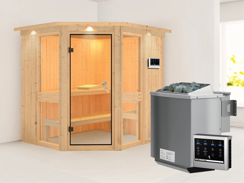 2 Liegen, Ofenschutzgitter aus stabilem Fichtenholz, 1 Kopfstütze aus Espenholz, Dachkranz inkl. 3 LED-Strahlern á 7, 5 Watt, 9 kW Bio-Ofen externer Steuerung, Montageanleitung.