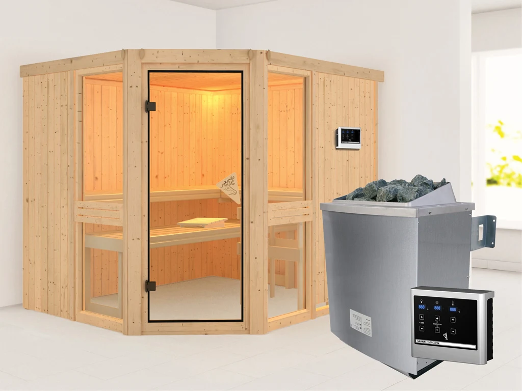 3 Liegen, Ofenschutzgitter aus stabilem Fichtenholz, Kopfstütze aus Espenholz, 9 kW Ofen mit externer Steuerung, Montageanleitung.