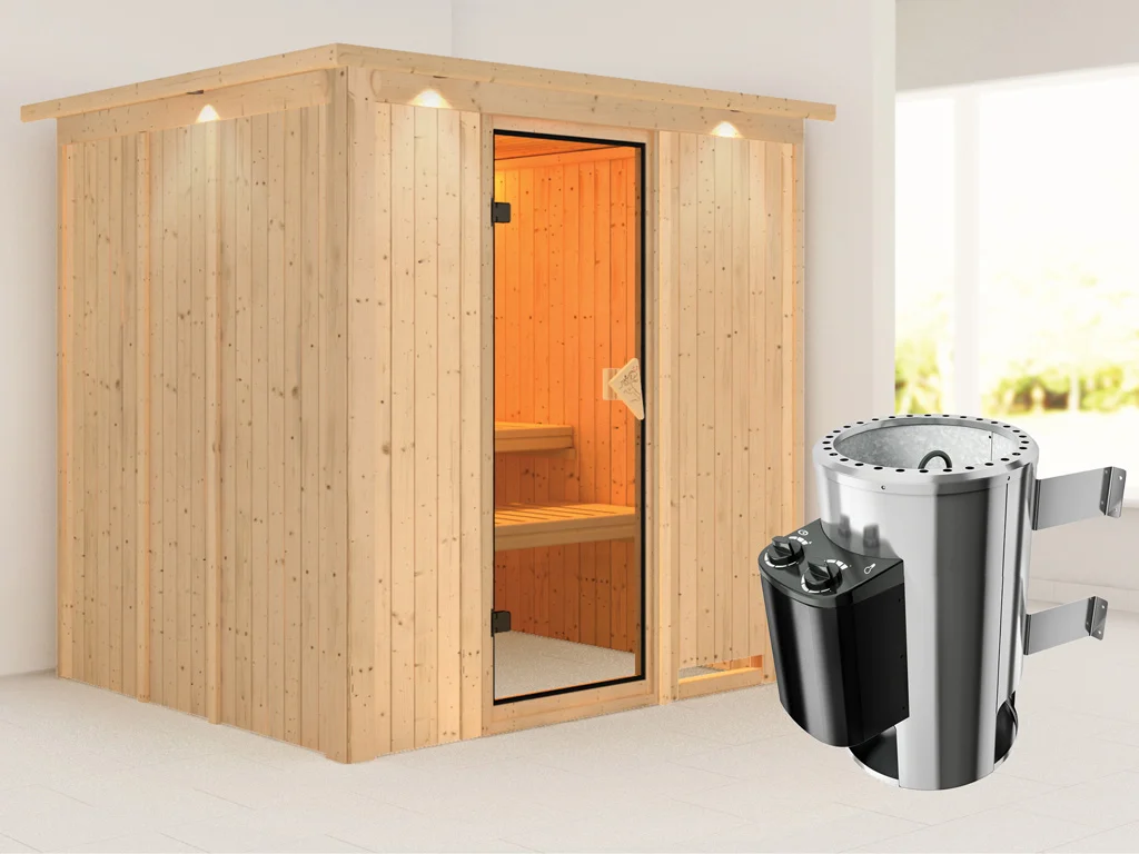 2 Liegen, Ofenschutzgitter aus stabilem Fichtenholz, 1 Kopfstütze aus Espenholz, 3, 6 kW Plug & Play Ofen mit integrierter Steuerung, Dachkranz inkl. 3 LED-Strahlern á 7, 5 Watt, Montageanleitung.